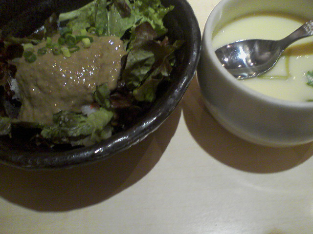 まず、サラダ(かにみそソースがのってる)と茶碗蒸しがきた。